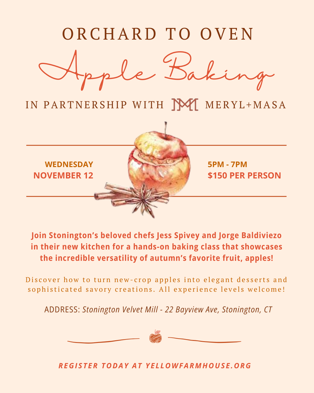Join Stonington’s beloved chefs Jess Spivey and Jorge Baldiviezo, owners of Stonington’s celebrated Meryl+Masa Sourdough Bakery and Latin Eatery, in their new kitchen for a hands-on baking class that showcases the incredible versatility of autumn's favorite fruit. Discover how to turn new-crop apples into both elegant desserts and sophisticated savory creations. All experience levels welcome!